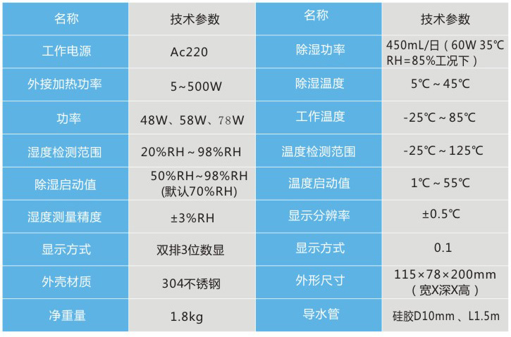 當(dāng)箱體溫度低于設(shè)定的啟動值時(shí),抽濕裝罝啟動內(nèi)部加熱器回路(加熱器外接,功率可接50~500W),直到箱體溫度升高到設(shè)定啟動值加5度時(shí),加熱器回路停止工作。
