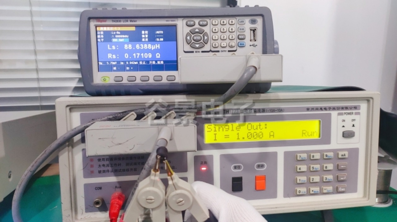 第二步:用夾具分別夾住工字電感的兩個(gè)引腳,在感值以上可以得到一個(gè)初始感值數(shù)據(jù);在電流測(cè)試儀器加載一個(gè)初始電流數(shù)值;加載初始電流的時(shí)候,測(cè)試儀器還未開(kāi)始工作哦。